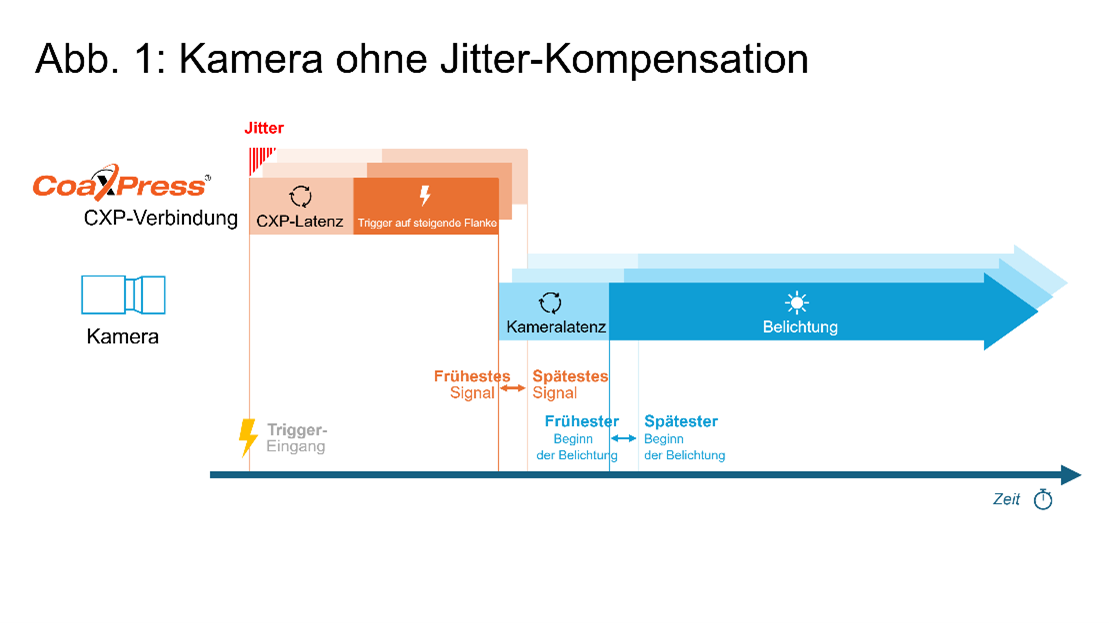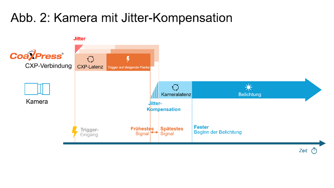 Also: Zusätzlich zur äußerst niedrigen Latenz bietet CoaXPress einen Host-to-Device-Trigger-Jitter, der lediglich der Verzögerung bis zur nächsten Zeichengrenze entspricht – typischerweise zwischen 0 und 480 ns. Dank der Jitter-Kompensation von CoaXPress reduziert die Kamera den Trigger-Jitter, indem sie die eingehenden Trigger-Signale aktiv für eine variable Dauer verzögert, sodass der Beginn der Belichtung stets mit der spätestmöglichen steigenden Flanke des Trigger-Signals synchronisiert ist. Dadurch wird der Jitter praktisch eliminiert, mit einem Rest-Jitter von nur 2 ns!