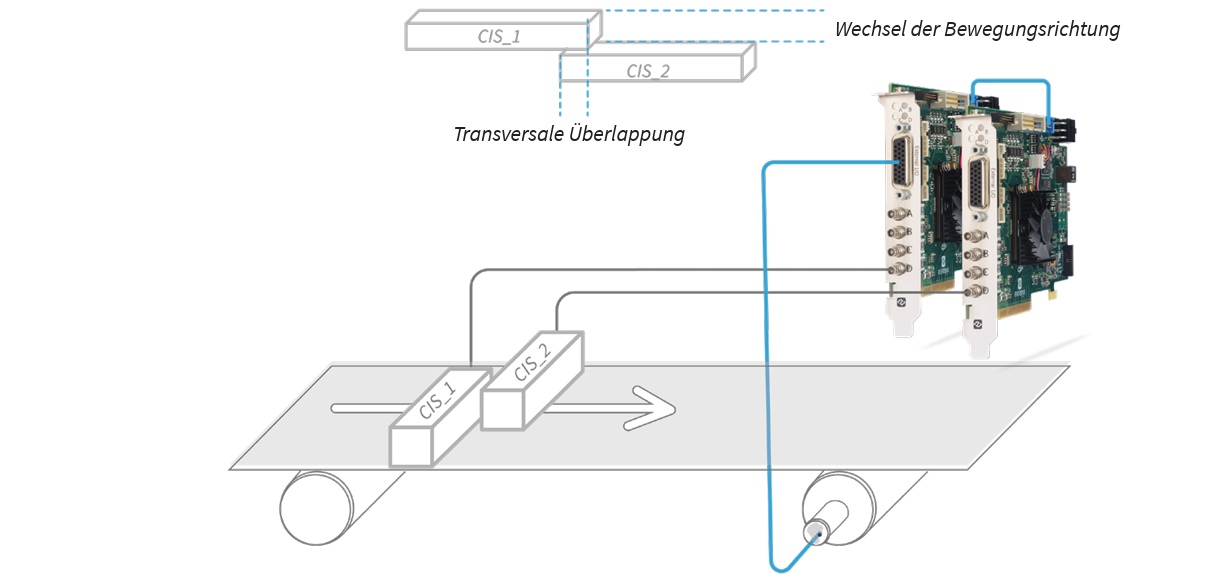 Wenn mehrere CIS erforderlich sind, um den gesamten zu prüfenden Bereich abzudecken, werden sie für gewöhnlich versetzt angeordnet. Dies dient dazu, den Verlust von Pixeln zwischen benachbarten CIS zu verhindern. In diesem Fall muss beim Zusammenfügen von Bildern die transversale Überlappung behoben und die Bewegungsrichtung gewechselt werden. Die Framegrabber von Euresys sind DMA-Agenten, d. h. das Zusammenfügen der Bilder wird während der Erfassung per DMA-Übertragung durchgeführt. Hierfür werden weder Prozessorleistung noch Bildkopien beansprucht.