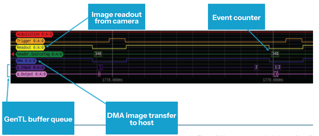 Events such as driver function calls, call backs, triggers received by the frame grabber, strobe signals sent to the light controller or camera control signals are all recorded along with precise time stamps and detailed context information.