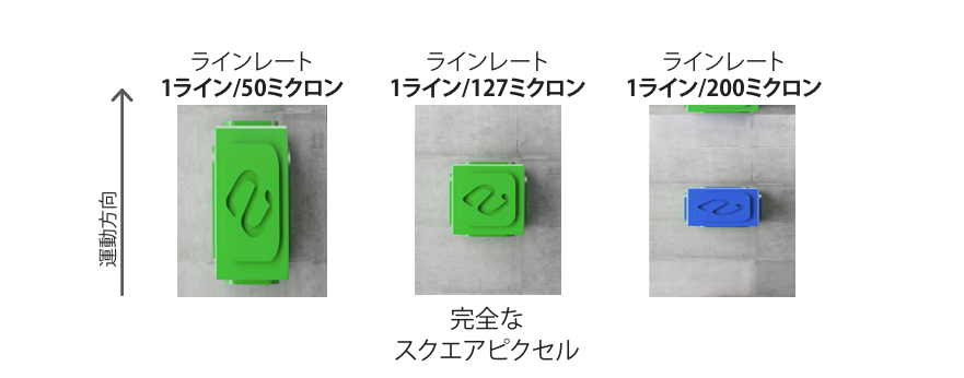 ラインスキャン用途を開発する際に取得した画像のアスペクト比を一定に保つには、モーションエンコーダを使用する必要があります。ただし、一般に「スクエアピクセル」と呼ばれる、運動と横移動で同じ解像度を得るには困難な場合があります。必要とされる1回転あたりのパルス数を備えたモーションエンコーダが常に入手できるとは限りません。